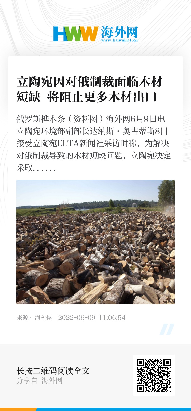 海外网6月9日电 立陶宛环境部副部长达纳斯·奥古蒂斯8日接受立陶宛ELTA新闻社采访时称,为解决对俄制裁导致的木材短缺问题,立陶宛决定采取行动阻止更多的木材出口到欧盟其他国家。