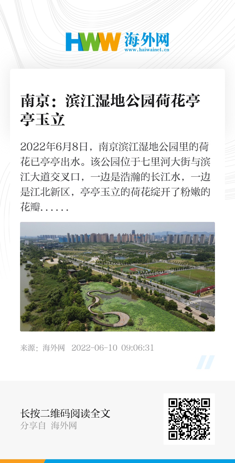 2022年6月8日,南京滨江湿地公园里的荷花已亭亭出水。该公园位于七里河大街与滨江大道交叉口,一边是浩瀚的长江水,一边是江北新区,亭亭玉立的荷花绽开了粉嫩的花瓣,显得更加美艳动人。图片来源:视觉中国