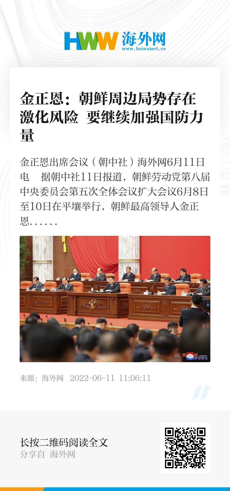 海外网6月11日电 据朝中社11日报道,朝鲜劳动党第八届中央委员会第五次全体会议扩大会议6月8日至10日在平壤举行,朝鲜最高领导人金正恩出席会议,要求继续大力加强国防力量建设。