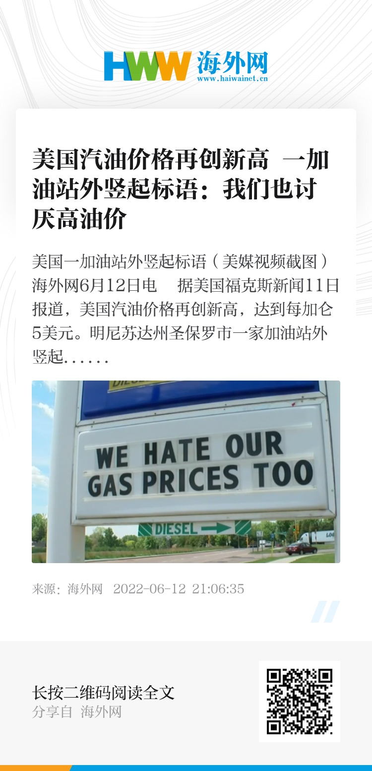 海外网6月12日电 据美国福克斯新闻11日报道,美国汽油价格再创新高,达到每加仑5美元。明尼苏达州圣保罗市一家加油站外竖起标语称:“我们也讨厌这么高的汽油价格。”这家加油站的老板查克·格拉夫称,想让顾客们知道,自己也对美国创纪录的高油价感到沮丧。
