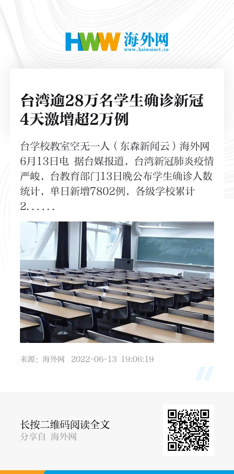 海外网6月13日电 据台媒报道,台湾新冠肺炎疫情严峻,台教育部门13日晚公布学生确诊人数统计,单日新增7802例,各级学校累计282604名学生染疫,全台共4330所学校全校或部分班级暂停实体课。