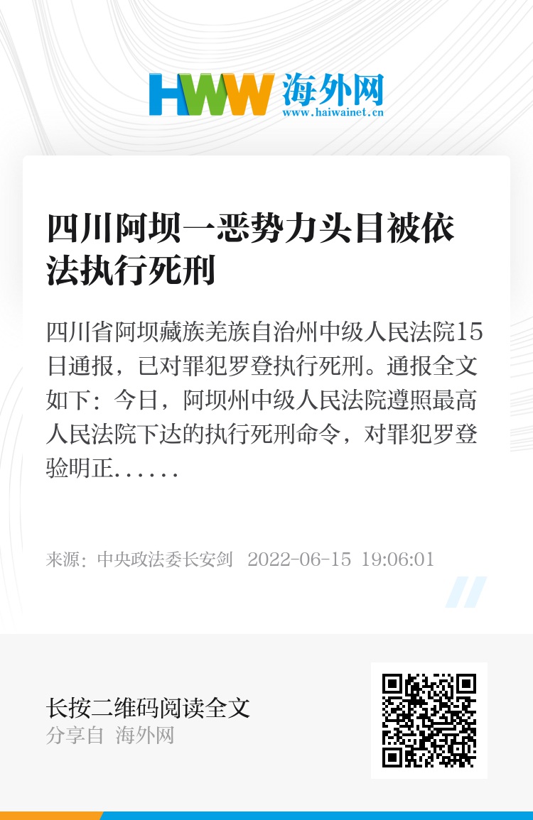 四川省阿坝藏族羌族自治州中级人民法院15日通报,已对罪犯罗登执行死刑。通报全文如下: