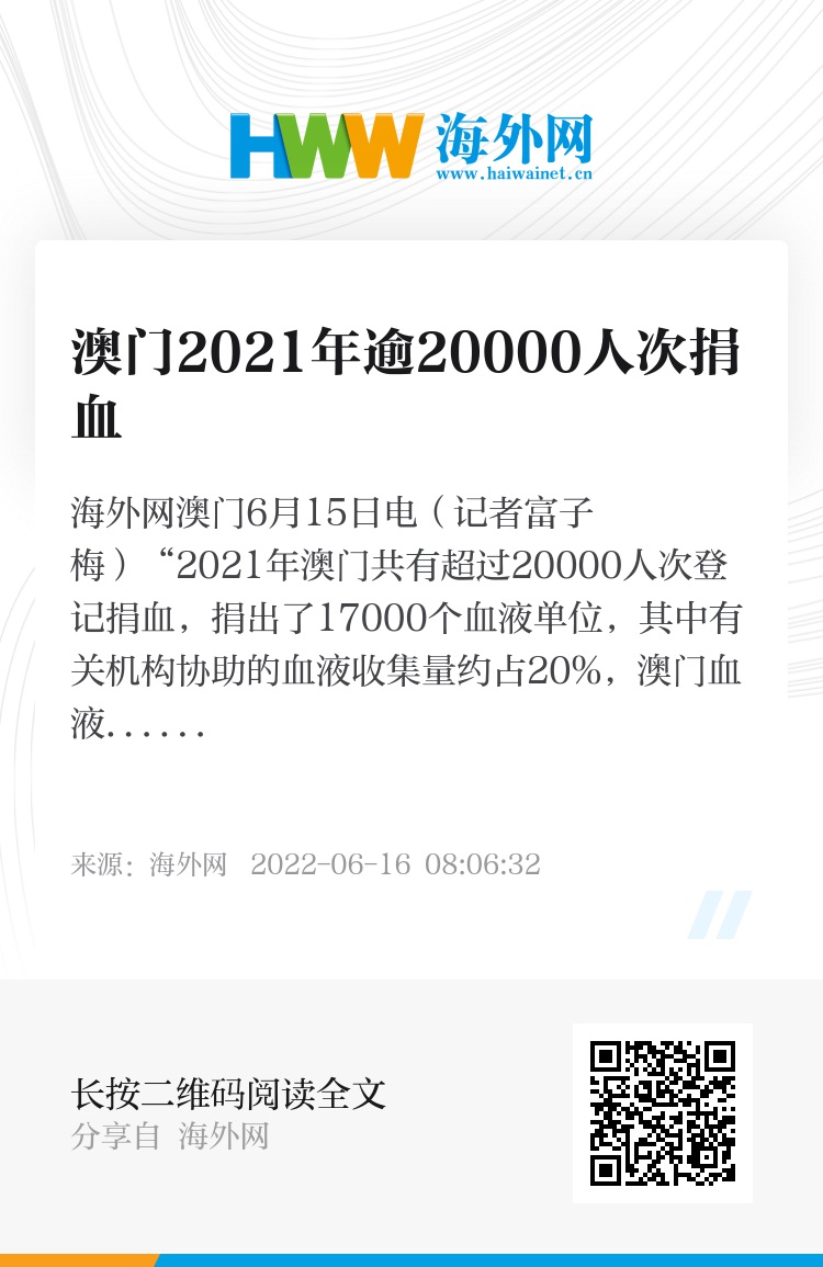 罗奕龙表示,2020年初至今,尽管澳门经济社会发展遇到挑战与困难,但在政府部门、私人企业、学校等机构及其成员共同努力和推动下,澳门始终储备充足血液。过去3年,有关机构协助捐血中心举办了302次的捐血活动,机构参与捐血共12610人次,协助捐血中心收集了10237个血液单位,占血液总收集量的21%。2021年,澳门共有超过20000人次登记捐血,捐出了17000个血液单位,其中机构协助的血液收集量约占20%。