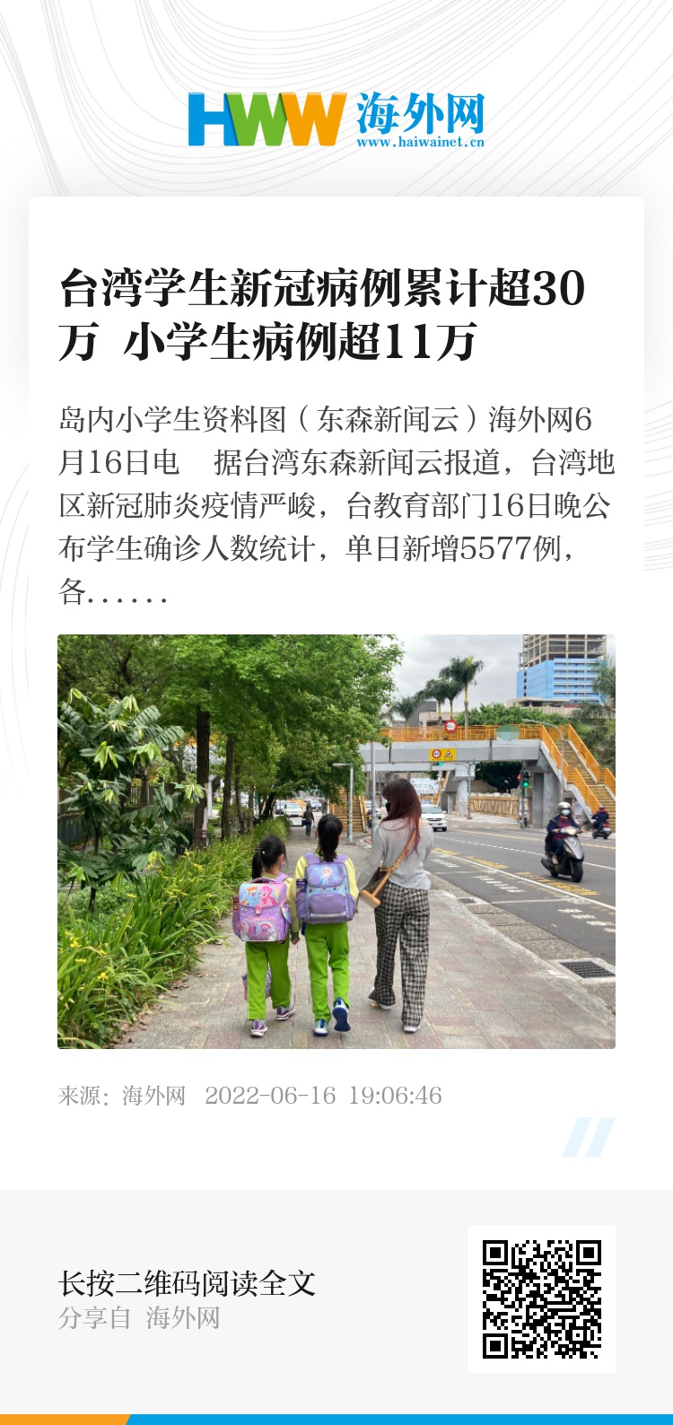海外网6月16日电 据台湾东森新闻云报道,台湾地区新冠肺炎疫情严峻,台教育部门16日晚公布学生确诊人数统计,单日新增5577例,各级学校学生累计确诊人数超过30万例,其中小学生病例就超过11万例。此外,全台共4263所学校全校或部分班级暂停实体课。