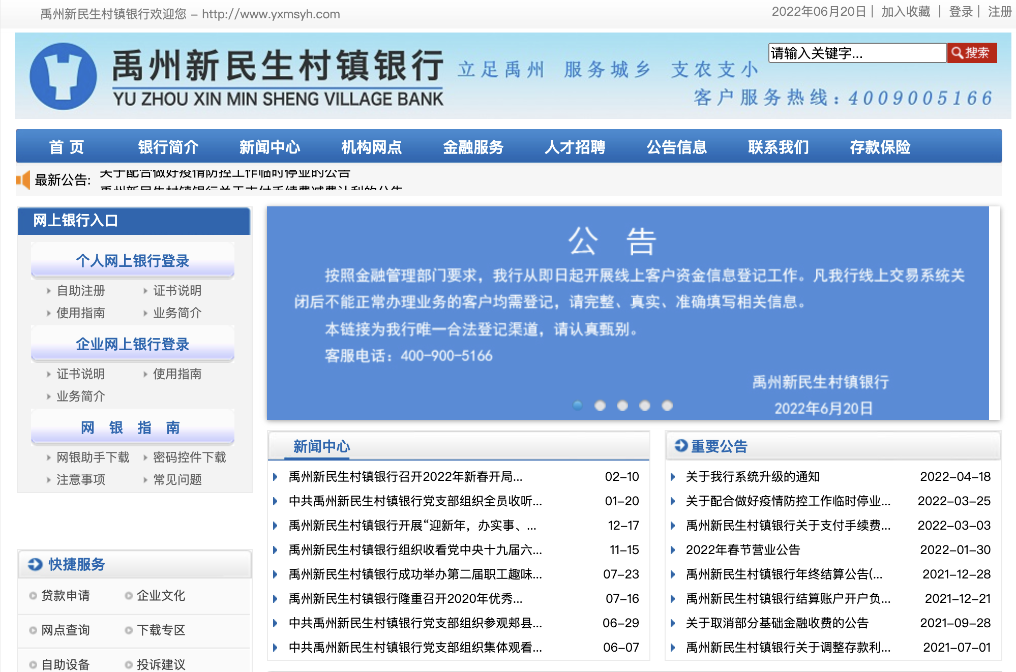 6月20日,河南禹州新民生村镇银行官网发布公告称,按照金融管理部门要求,该行从即日起开展线上客户资金信息登记工作,凡该行线上交易系统关闭后不能正常办理业务的客户均需登记,请完整、真实、准确填写相关信息。
