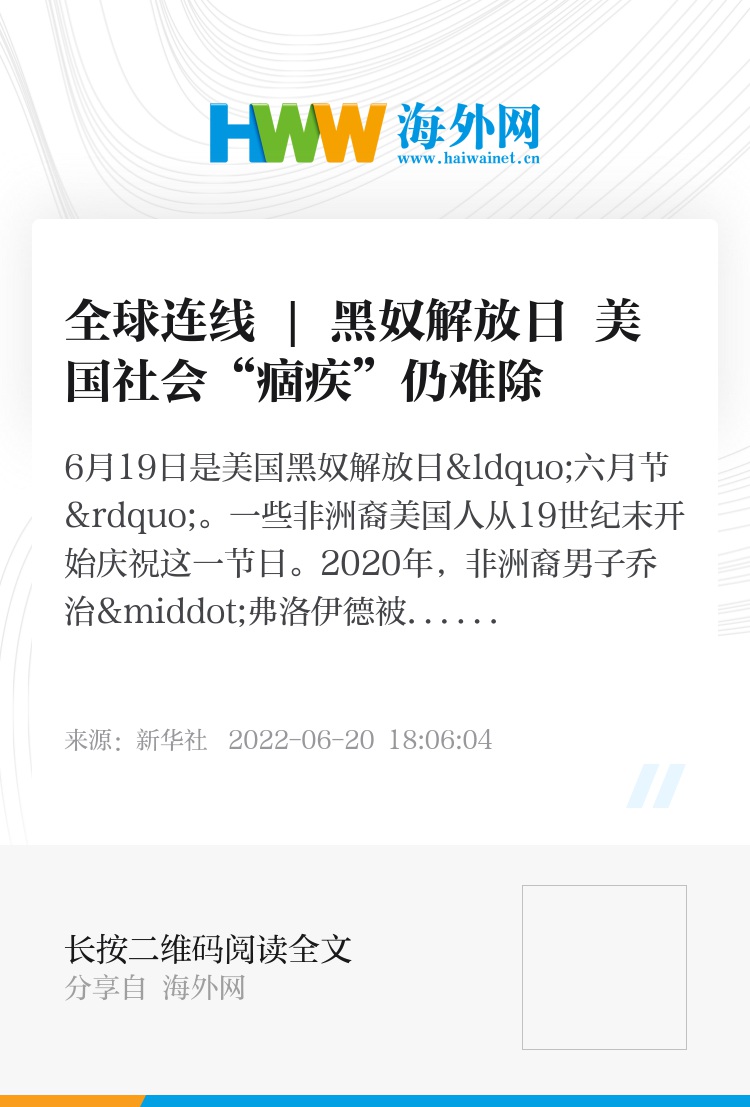 6月19日是美国黑奴解放日“六月节”。一些非洲裔美国人从19世纪末开始庆祝这一节日。2020年,非洲裔男子乔治·弗洛伊德被白人警察跪压致死,引发全美反种族歧视抗议浪潮,有着150多年历史的“六月节”被更多人所知。2021年开始,这一天成为联邦公共假日。