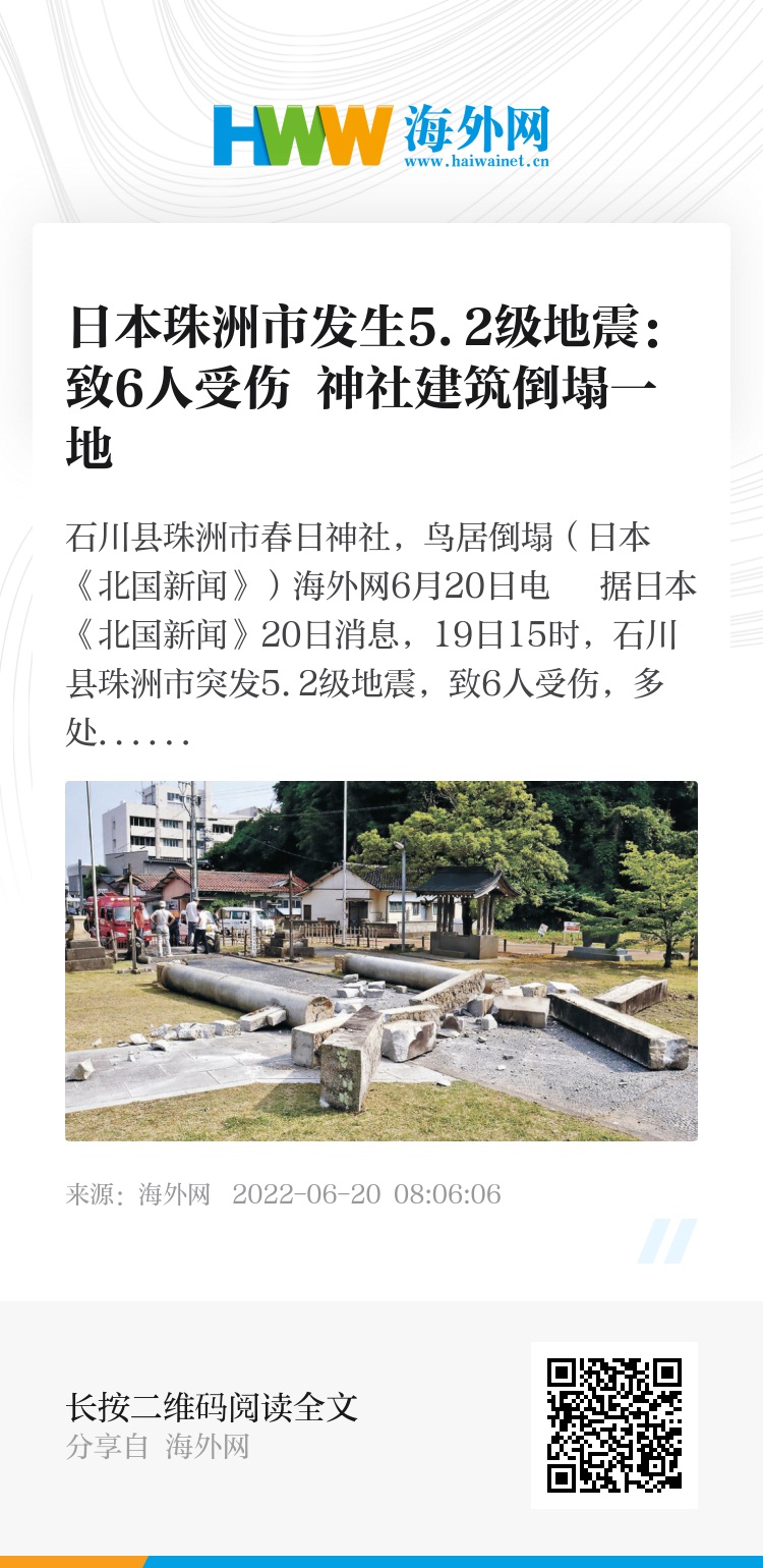 海外网6月20日电 据日本《北国新闻》20日消息,19日15时,石川县珠洲市突发5.2级地震,致6人受伤,多处建筑倒塌。该市今年来已发生87次地震。