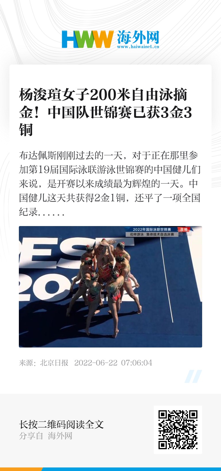 至此,中国健儿自6月17日本届世锦赛开赛以来,共获得了3金3铜。值得一提的是,匈牙利名将米拉克在这天的男子200米蝶泳决赛中,以1分50秒34打破了由他自己在上届世锦赛上创造的1分50秒73的原世界纪录。这也是本届世锦赛游泳项目刷新的第二项世界纪录。