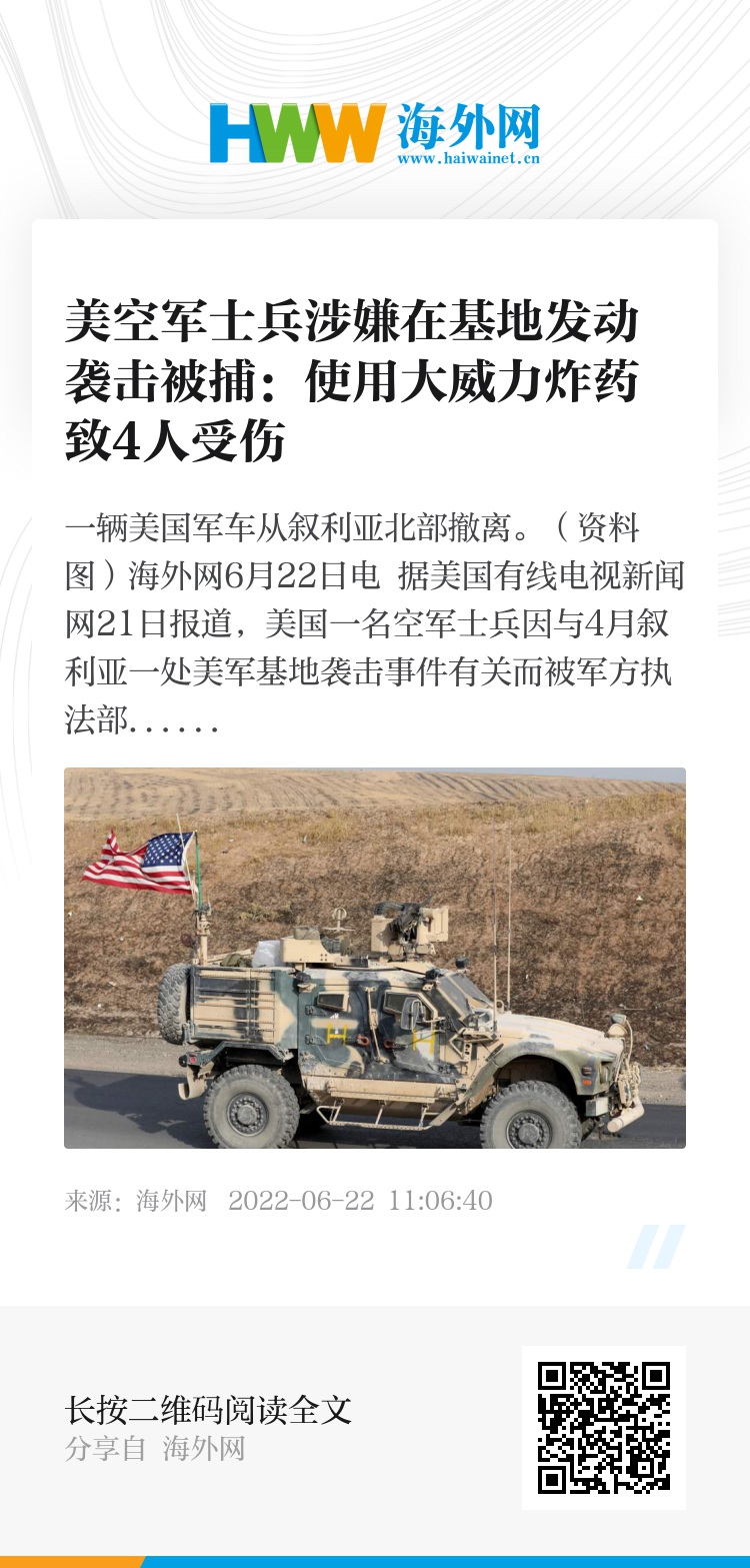 海外网6月22日电 据美国有线电视新闻网21日报道,美国一名空军士兵因与4月叙利亚一处美军基地袭击事件有关而被军方执法部门逮捕,该事件造成4名美国军人受伤。