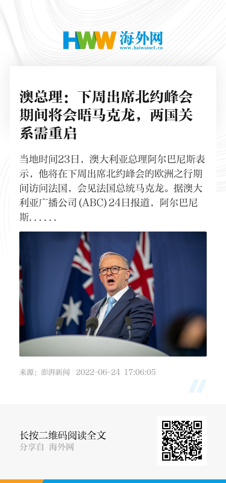 当地时间23日,澳大利亚总理阿尔巴尼斯表示,他将在下周出席北约峰会的欧洲之行期间访问法国,会见法国总统马克龙。