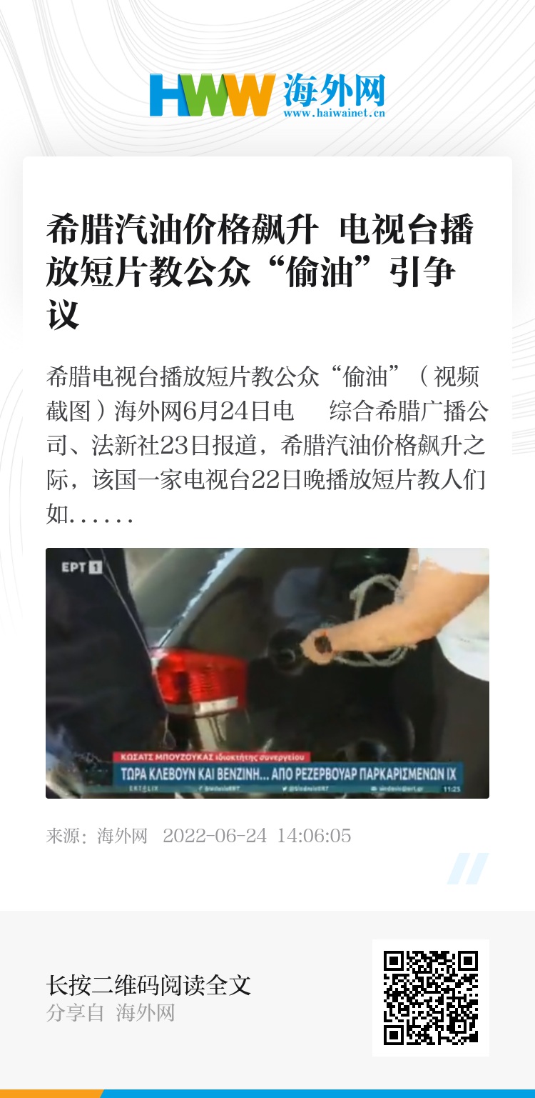 海外网6月24日电 综合希腊广播公司、法新社23日报道,希腊汽油价格飙升之际,该国一家电视台22日晚播放短片教人们如何“偷油”。节目中,一名汽车专家向公众展示如何从汽车中抽出汽油,这名专家还钻到一辆汽车下面,展示如何从汽车下面刺破油箱获取汽油。
