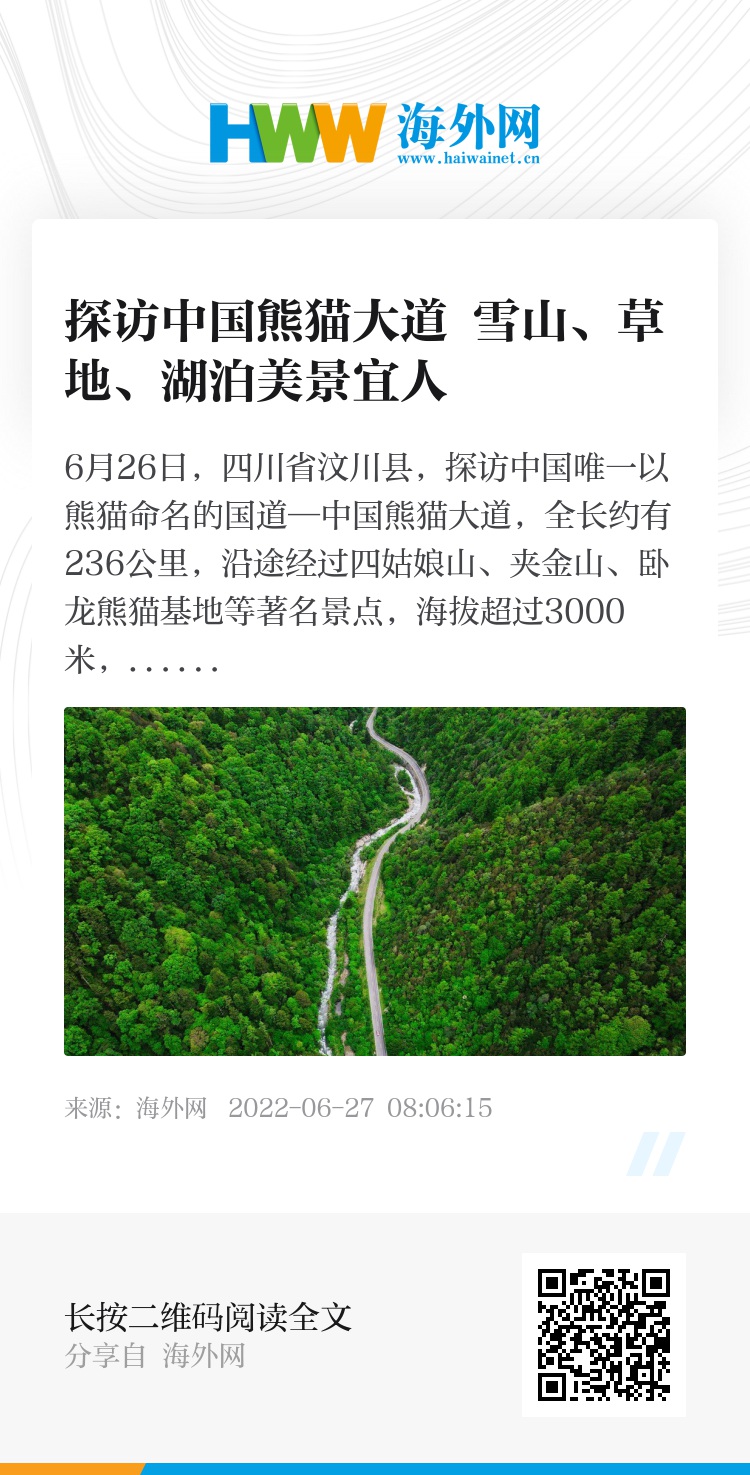 6月26日,四川省汶川县,探访中国唯一以熊猫命名的国道—中国熊猫大道,全长约有236公里,沿途经过四姑娘山、夹金山、卧龙熊猫基地等著名景点,海拔超过3000米,雪山、草地、湖泊等美景宜人。据悉,中国熊猫大道为国道350的其中一段,起止点分别为四川炉霍县和汶川县映秀镇,全程约500多公里。图片来源:IC photo