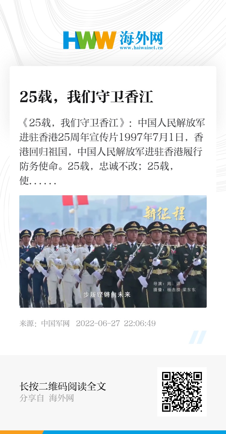 宣传片《25载,我们守卫香江》用4分42秒时间带领大家穿越时空、见证历史,一同感受驻香港部队驻军治军的生动实践,展望香港更加美好的明天。