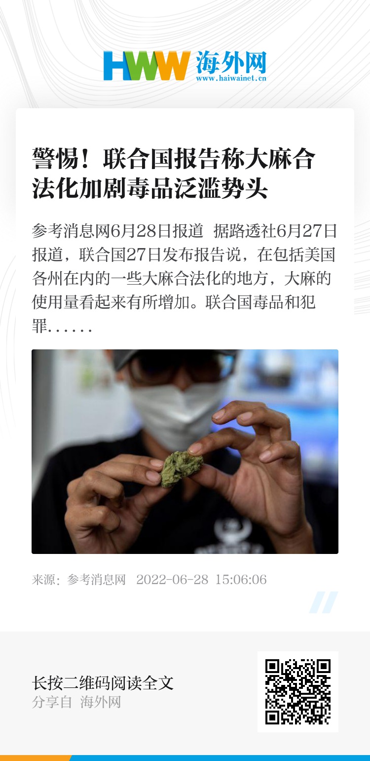 参考消息网6月28日报道 据路透社6月27日报道,联合国27日发布报告说,在包括美国各州在内的一些大麻合法化的地方,大麻的使用量看起来有所增加。