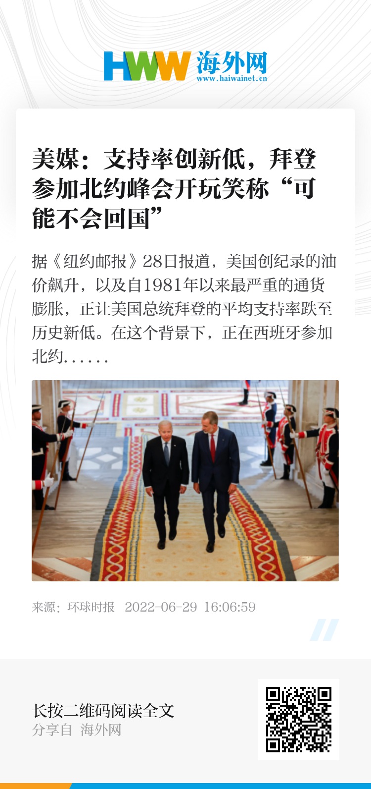 据《纽约邮报》28日报道,美国创纪录的油价飙升,以及自1981年以来最严重的通货膨胀,正让美国总统拜登的平均支持率跌至历史新低。在这个背景下,正在西班牙参加北约峰会的拜登周二开玩笑说,他可能不会从西班牙返回美国了。对此,《纽约邮报》问道:“他真的是在开玩笑吗?”