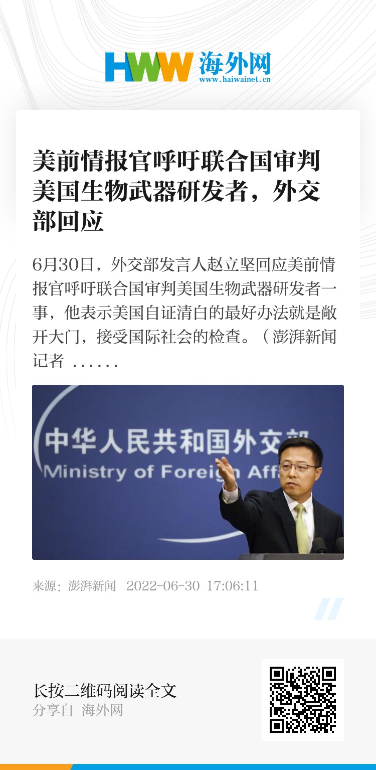6月30日,外交部发言人赵立坚回应美前情报官呼吁联合国审判美国生物武器研发者一事,他表示美国自证清白的最好办法就是敞开大门,接受国际社会的检查。(澎湃新闻记者 于潇清 史含伟 王露)