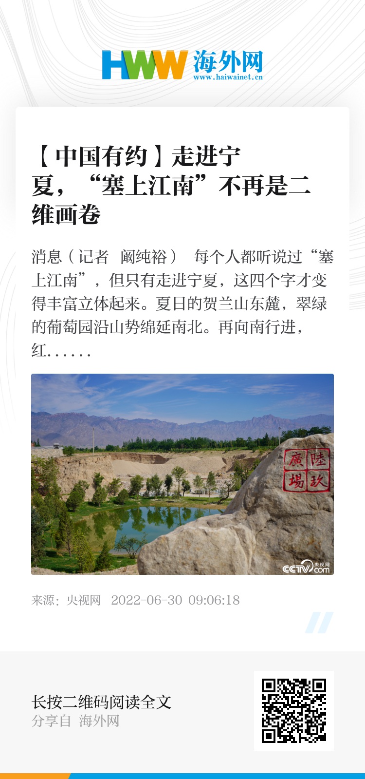 央视网消息(记者 阚纯裕) 每个人都听说过“塞上江南”,但只有走进宁夏,这四个字才变得丰富立体起来。夏日的贺兰山东麓,翠绿的葡萄园沿山势绵延南北。再向南行进,红彤彤的枸杞挂满枝头。大漠中,光伏“阵列”静静矗立,黄河蜿蜒流过。走到宁夏最南端,巍巍六盘山层峦叠嶂,山水叮咚作响。