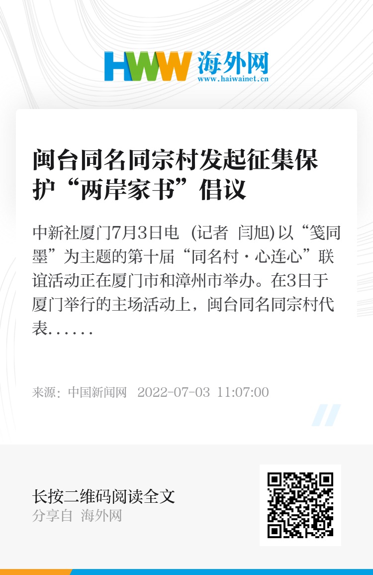 中新社厦门7月3日电 (记者 闫旭)以“笺同墨”为主题的第十届“同名村·心连心”联谊活动正在厦门市和漳州市举办。