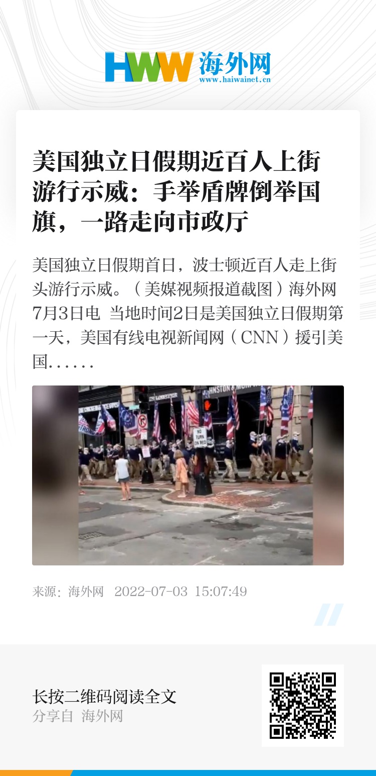 海外网7月3日电 当地时间2日是美国独立日假期第一天,美国有线电视新闻网(CNN)援引美国波士顿警察局消息称,当天中午,一大群人手持旗帜和盾牌,沿着波士顿市中心“自由之路”游行示威。
