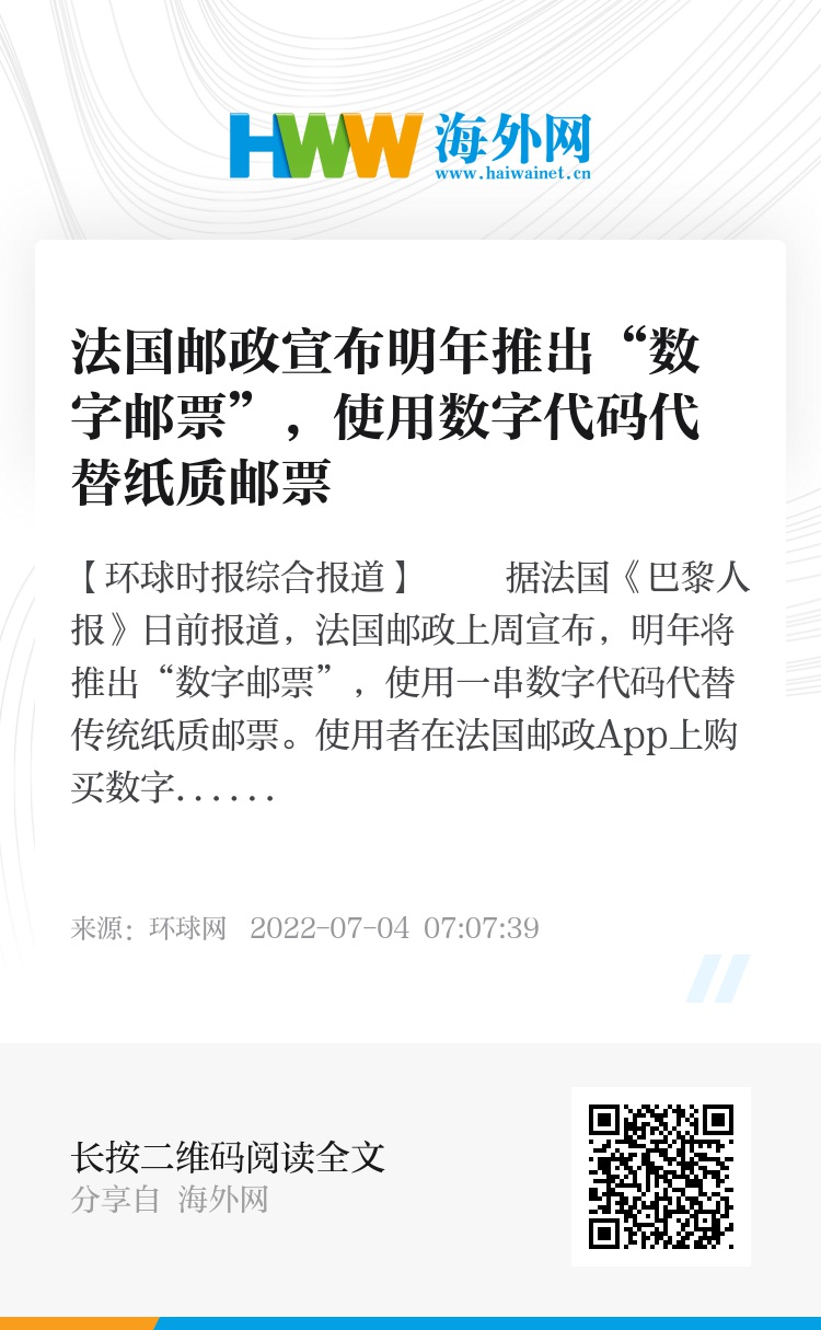 【环球时报综合报道】 据法国《巴黎人报》日前报道,法国邮政上周宣布,明年将推出“数字邮票”,使用一串数字代码代替传统纸质邮票。使用者在法国邮政App上购买数字邮票后便会得到一个由数字和字母组成的8位代码,用笔抄写在信封上即可送出邮寄。