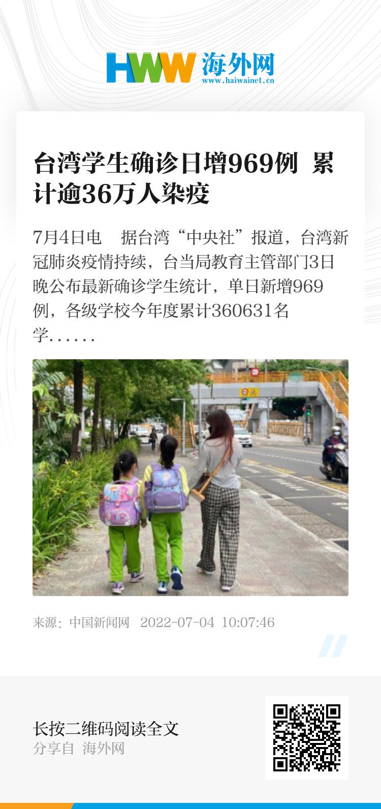 中新网7月4日电 据台湾“中央社”报道,台湾新冠肺炎疫情持续,台当局教育主管部门3日晚公布最新确诊学生统计,单日新增969例,各级学校今年度累计360631名学生染疫。
