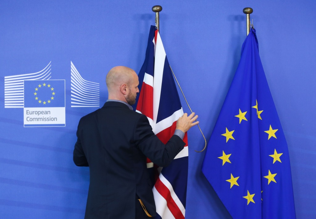 2019年10月17日,在比利时布鲁塞尔的欧盟总部,工作人员整理英国和欧盟的旗帜。新华社记者郑焕松摄