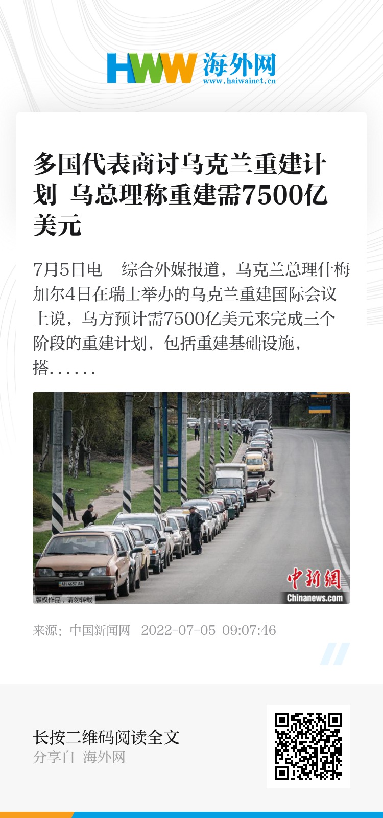 中新网7月5日电 综合外媒报道,乌克兰总理什梅加尔4日在瑞士举办的乌克兰重建国际会议上说,乌方预计需7500亿美元来完成三个阶段的重建计划,包括重建基础设施,搭建临时住房、医院和学校,以及对国家进行长期改造等。