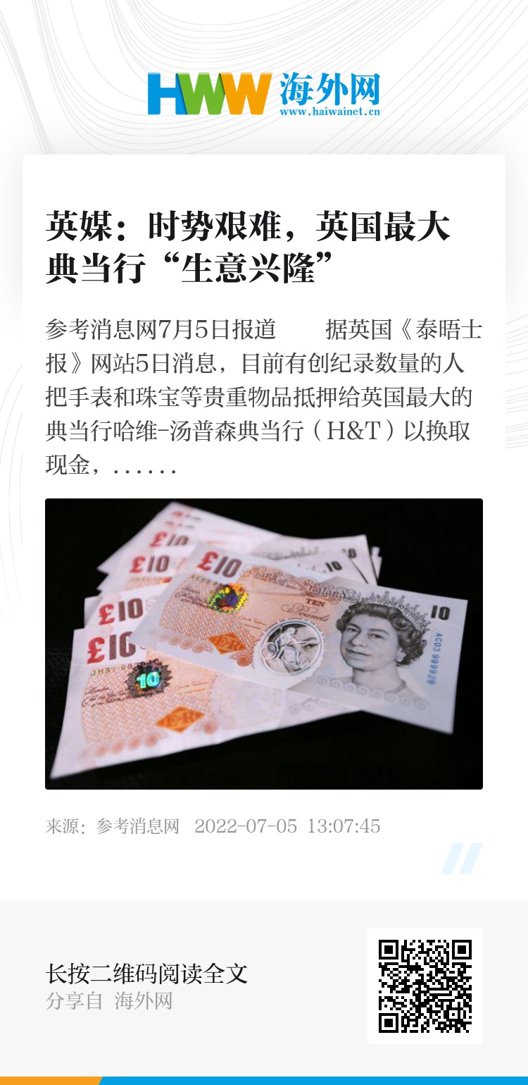 参考消息网7月5日报道 据英国《泰晤士报》网站5日消息,目前有创纪录数量的人把手表和珠宝等贵重物品抵押给英国最大的典当行哈维-汤普森典当行(H&T)以换取现金,凸显了英国当前生活成本危机的严重性。