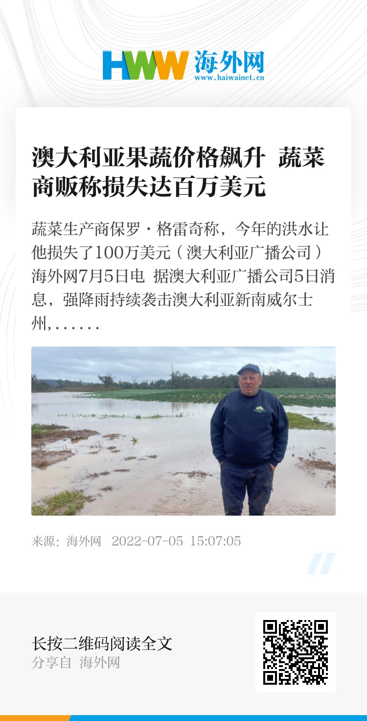 澳大利亚蔬菜产业集团发言人卡特尔(Tyson Cattle)表示,澳大利亚东部的种植业者遭受了自然灾害的长期影响,不断上涨的成本不得不转嫁给消费者。卡特尔说,根据生产商报告,他们的生产成本增加了35%至45%。(海外网 王珊宁)