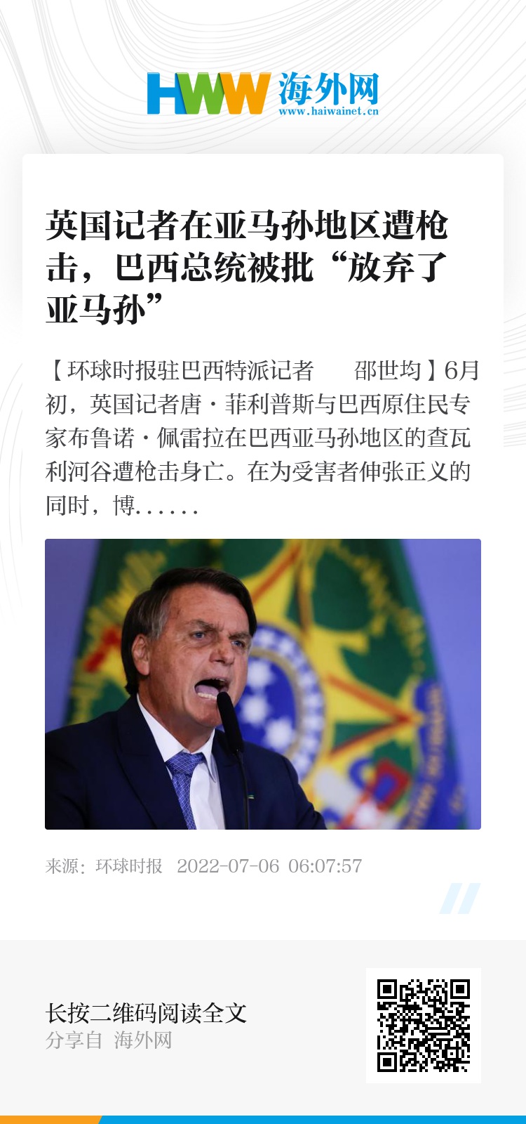 【环球时报驻巴西特派记者 邵世均】6月初,英国记者唐·菲利普斯与巴西原住民专家布鲁诺·佩雷拉在巴西亚马孙地区的查瓦利河谷遭枪击身亡。在为受害者伸张正义的同时,博索纳罗政府的环境保护与原住民政策也再次受到指责。