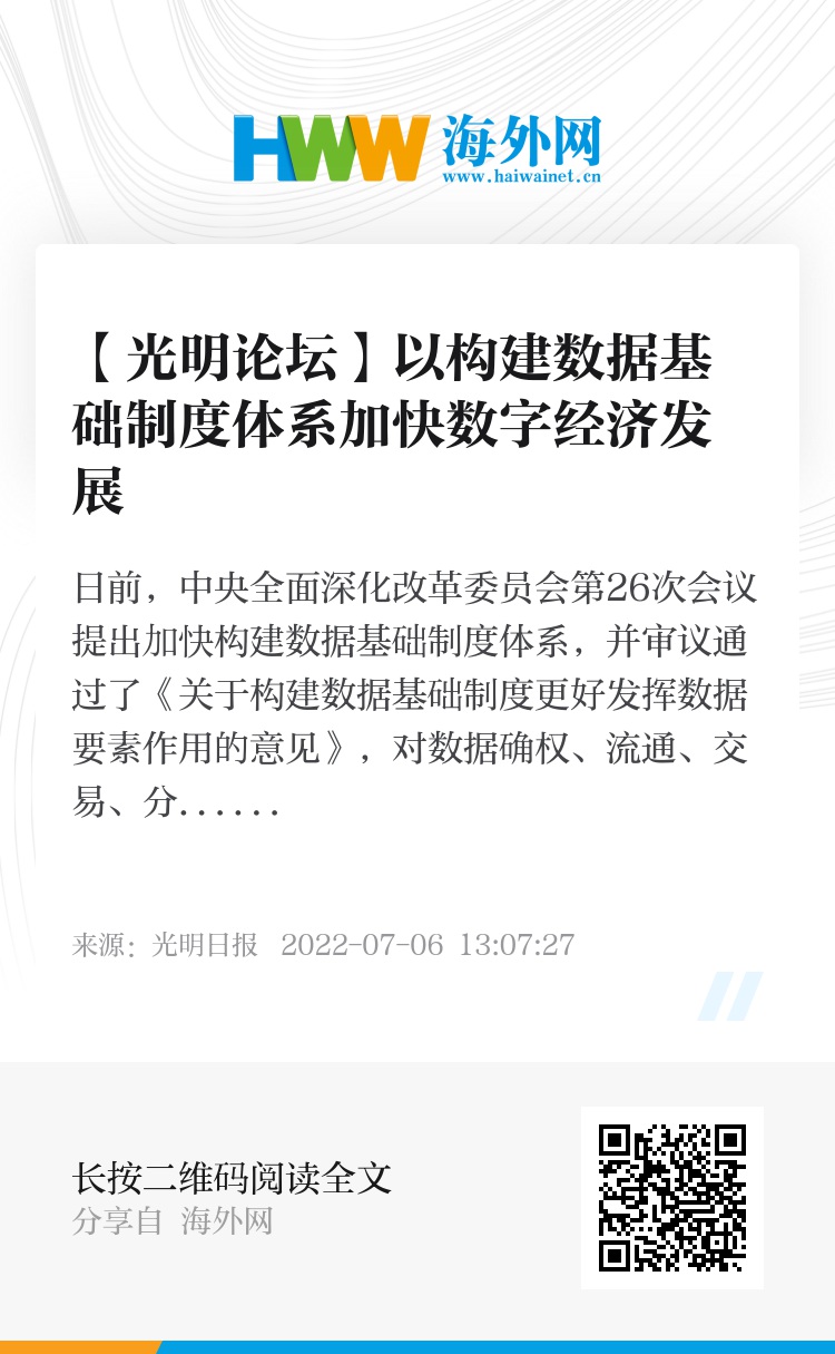 总之,数据既是一种生产要素,也是资源配置的重要方式,关系线上经济活动的各个环节和链条。对数据确权、流通、交易、分配以及安全等方面进行合理的制度设计,可以构建完善的数据基础制度体系,从而有效加快数字经济规范发展以及经济高质量发展。
