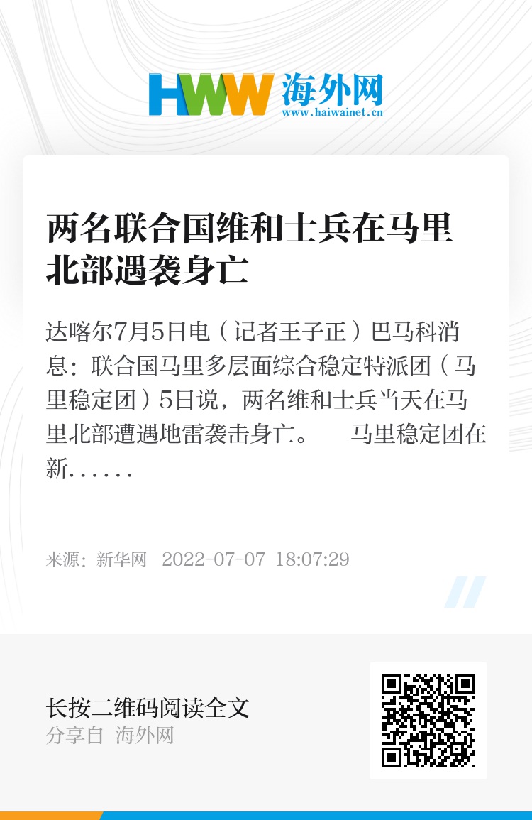 新华社达喀尔7月5日电(记者王子正)巴马科消息:联合国马里多层面综合稳定特派团(马里稳定团)5日说,两名维和士兵当天在马里北部遭遇地雷袭击身亡。