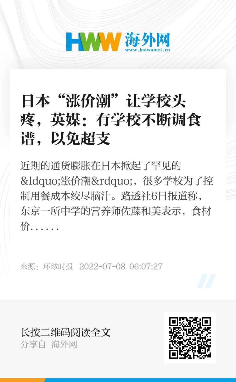 作为纾困措施的一部分,日本政府曾于4月表示,将提供资金协助学校应对餐饮成本高涨。但佐藤担心未来能源和食品价格会进一步上涨,尤其是在学年即将结束、政府调拨的资金快要用尽时。“今年的雨季结束得早,可能会对蔬菜有很大影响”,佐藤表示,“我很担心秋后的菜价”。(陈雅函)