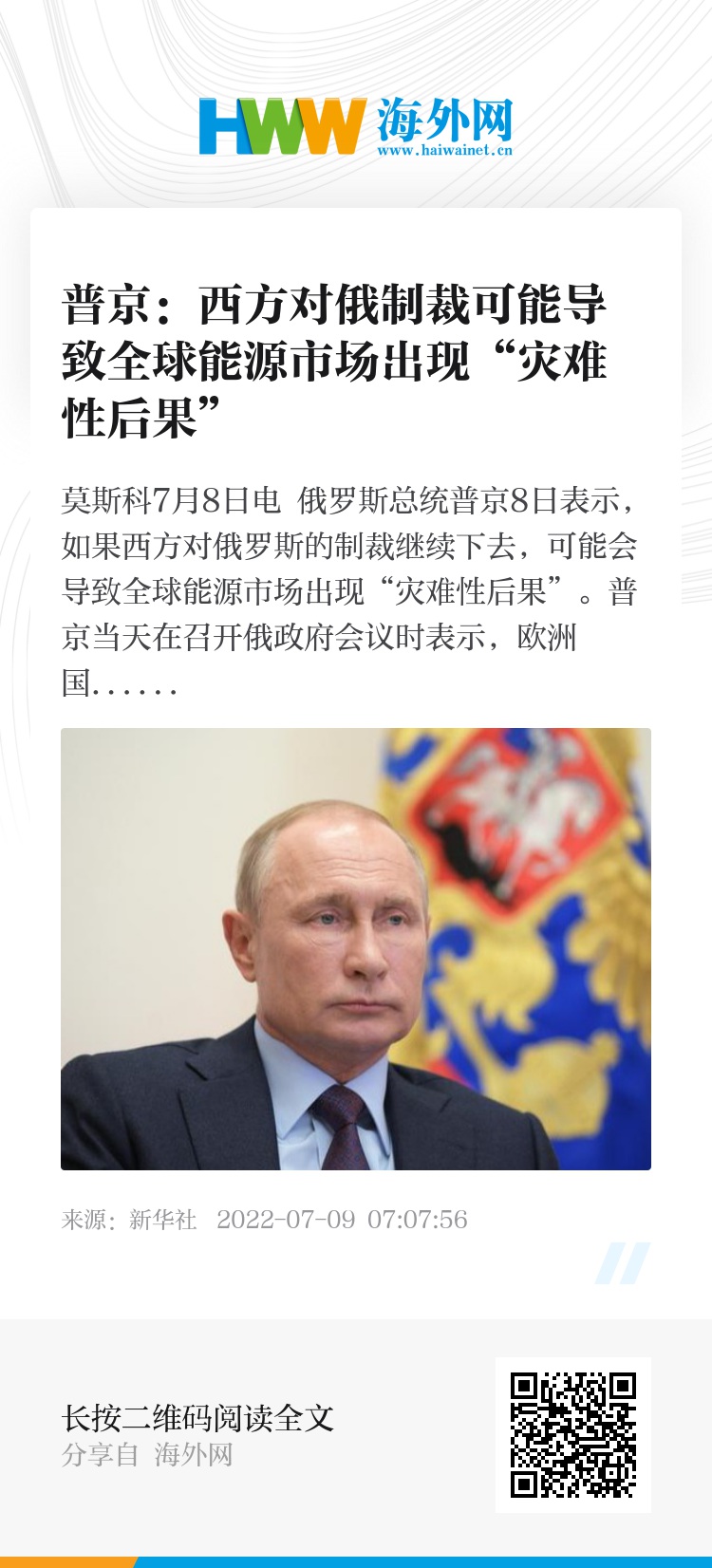 新华社莫斯科7月8日电 俄罗斯总统普京8日表示,如果西方对俄罗斯的制裁继续下去,可能会导致全球能源市场出现“灾难性后果”。