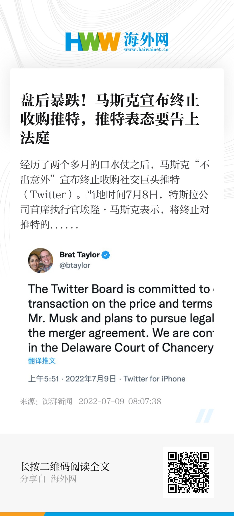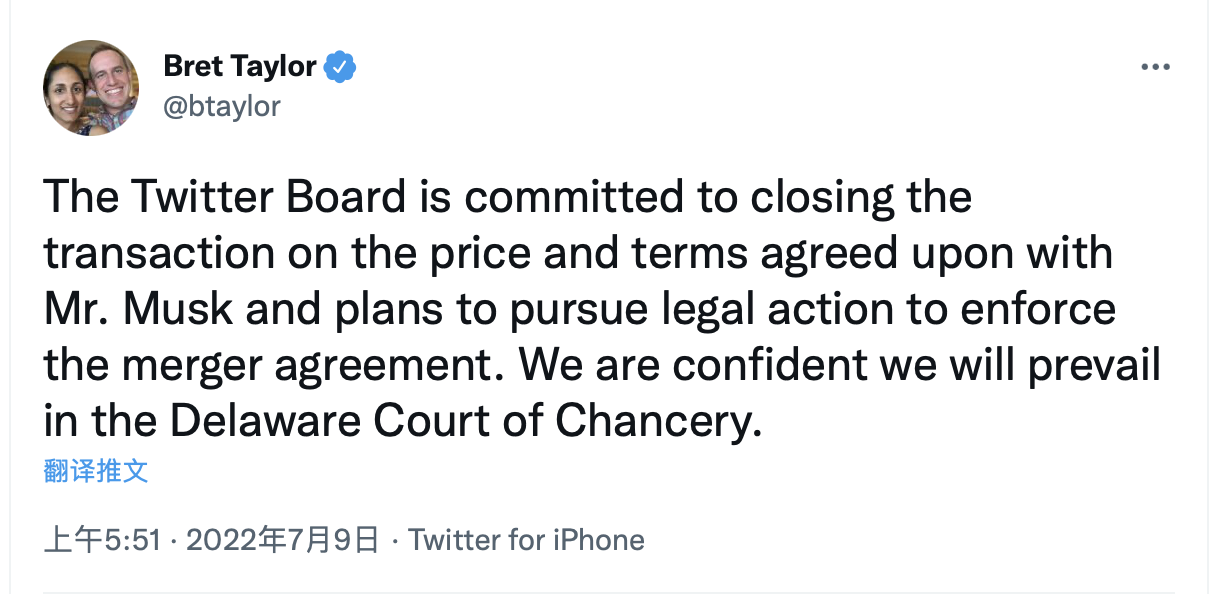 Twitter董事长Bret Taylor表示,董事会致力于按照与马斯克约定的条款完成交易,并计划采取法律行动执行合并协议,推特有信心在在特拉华州衡平法院胜诉。