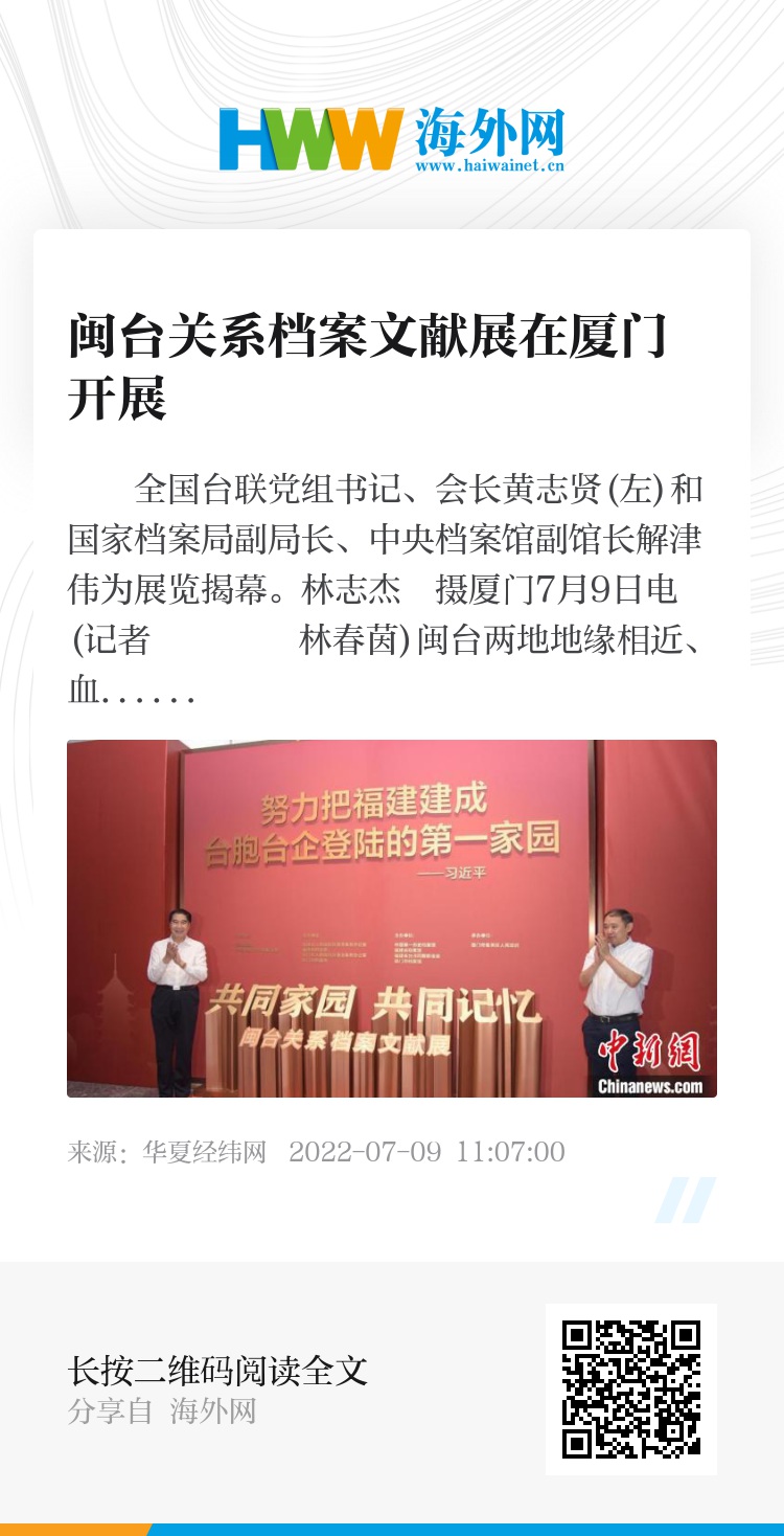 开展仪式上,全国台联党组书记、会长黄志贤在致辞中表示,福建与台湾隔海相望、同根同源,是2300万台胞的主要祖籍地,两岸同胞血脉相连、命运与共,两岸文化祖同宗、语同音、曲同调、俗同风、食同味,福建在探索两岸融合发展新路上具有天然优势。“共同家园共同记忆——闽台关系档案文献展”是“迁台记忆”档案文献工作成果的集中展现。希望加强宣传、扩大影响,持续为推动两岸融合发展、促进同胞心灵契合做出更大努力。