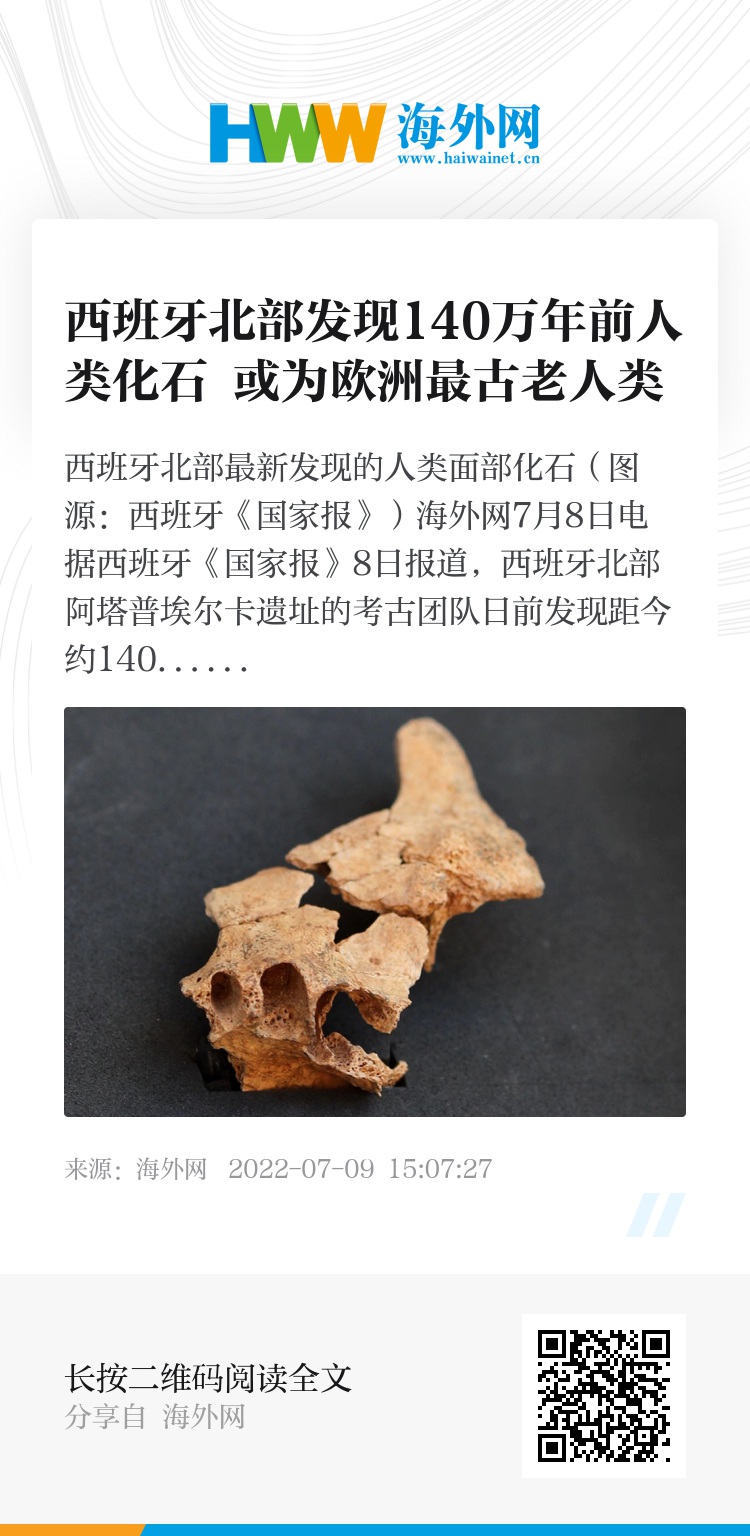 此前,欧洲最古老的人类化石是于2007年同样在阿塔普埃尔卡山区出土的人类牙齿化石,证实人类在欧洲生活的历史超过了120万年。最新发现的人类化石正位于其下方2米深处的地层当中。(海外网 汪晓宇)