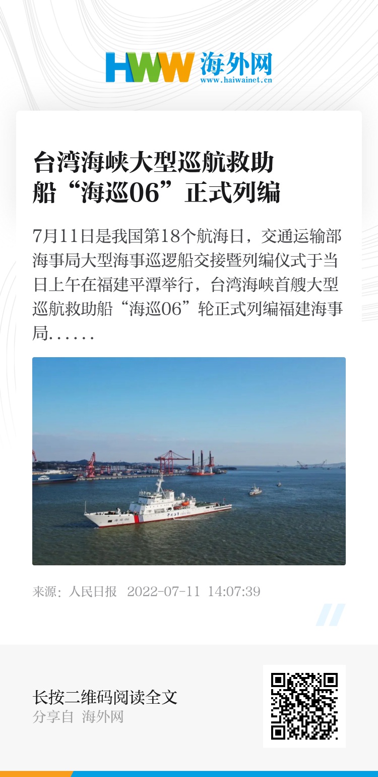 7月11日是我国第18个航海日,交通运输部海事局大型海事巡逻船交接暨列编仪式于当日上午在福建平潭举行,台湾海峡首艘大型巡航救助船“海巡06”轮正式列编福建海事局。