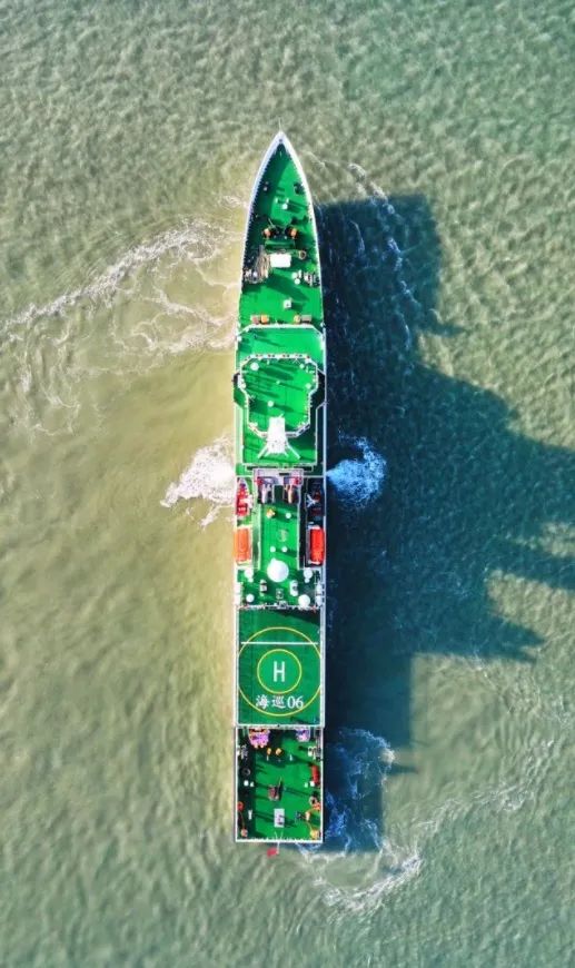 “海巡06”轮由武昌船舶重工集团有限公司建造,船长128米,型宽16米,型深7.9米,满载排水量6600吨,主推进系统总功率13920千瓦,最高航速23节,续航力10000海里,自持力60天,能够到达全球除南北极以外的所有海域。该轮能在12级风、9级海况下进行深远海巡航,在11级风、7级海况下开展海事执法活动。搭载船用北斗系统、GPS全球定位系统和多星联动的卫星通信设备,设有计算、存储和通信功能强大的网络数据中心,具有动态感知、监测预警、信息处理、综合指挥等能力,可作为独立、立体、移动的海事行政执法单元执行海上巡视、海事监管、海上交通事故调查处理和船舶污染监测等任务,也可与通信指挥车、海事巡查车、其他执法船艇、直升机、无人机以及VTS(船舶交通管理系统)、AIS(船舶自动识别系统)协同配合,是构建“陆海空天”一体化综合监管和快速反应系统的重要组成部分。
