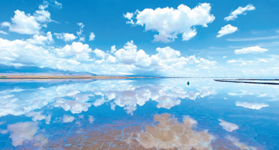 茶卡盐湖清澈的卤水下,是厚达几米、矿化程度很好的盐层,而高浓度的卤水,在日光的映射下,天水一色,将蓝天白云映衬在湖面。丝绸般轻柔的卤水,浸润着洁白的盐层。加之这里地势平坦,水域宽广,银波粼粼,湖面具有强烈的反射能力,如同一面镜子,因此,被称为中国的“天空之镜”。 传说中的天空之镜是乌尤尼盐沼,它位于南美玻利维亚西南部的乌尤尼小镇附近。而茶卡则被赞誉为中国的天空之境,与玻利维亚相比,这里是一片少为人触及的静谧之地。