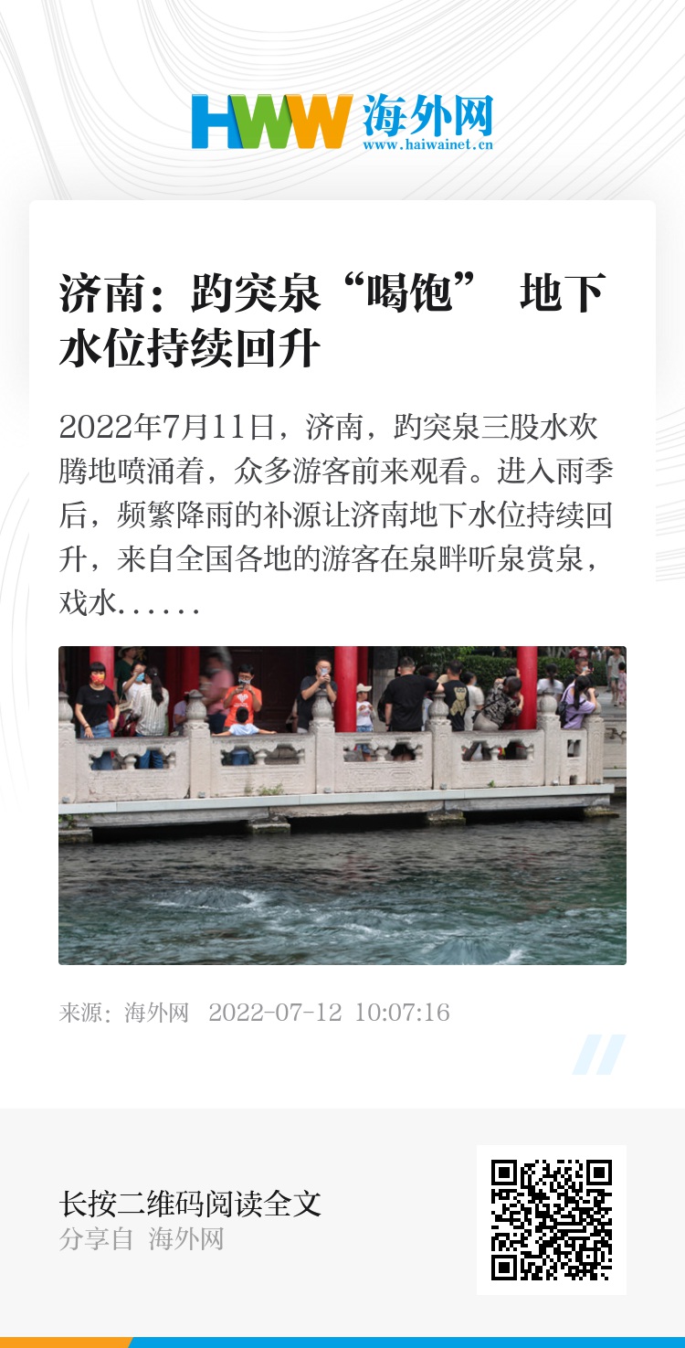 2022年7月11日,济南,趵突泉三股水欢腾地喷涌着,众多游客前来观看。进入雨季后,频繁降雨的补源让济南地下水位持续回升,来自全国各地的游客在泉畔听泉赏泉,戏水纳凉,拍照留念。图片来源:视觉中国