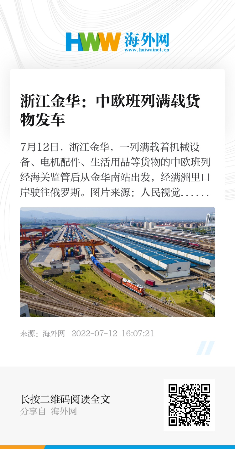 7月12日,浙江金华,一列满载着机械设备、电机配件、生活用品等货物的中欧班列经海关监管后从金华南站出发,经满洲里口岸驶往俄罗斯。