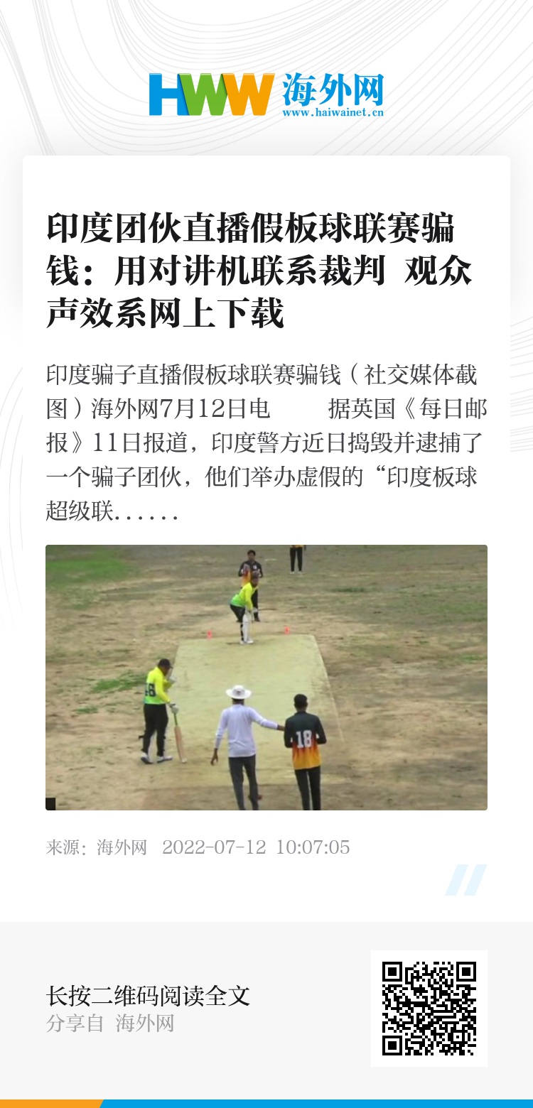 海外网7月12日电 据英国《每日邮报》11日报道,印度警方近日捣毁并逮捕了一个骗子团伙,他们举办虚假的“印度板球超级联赛”骗钱,用对讲机提醒裁判下注结果,裁判再向球员发出信号。