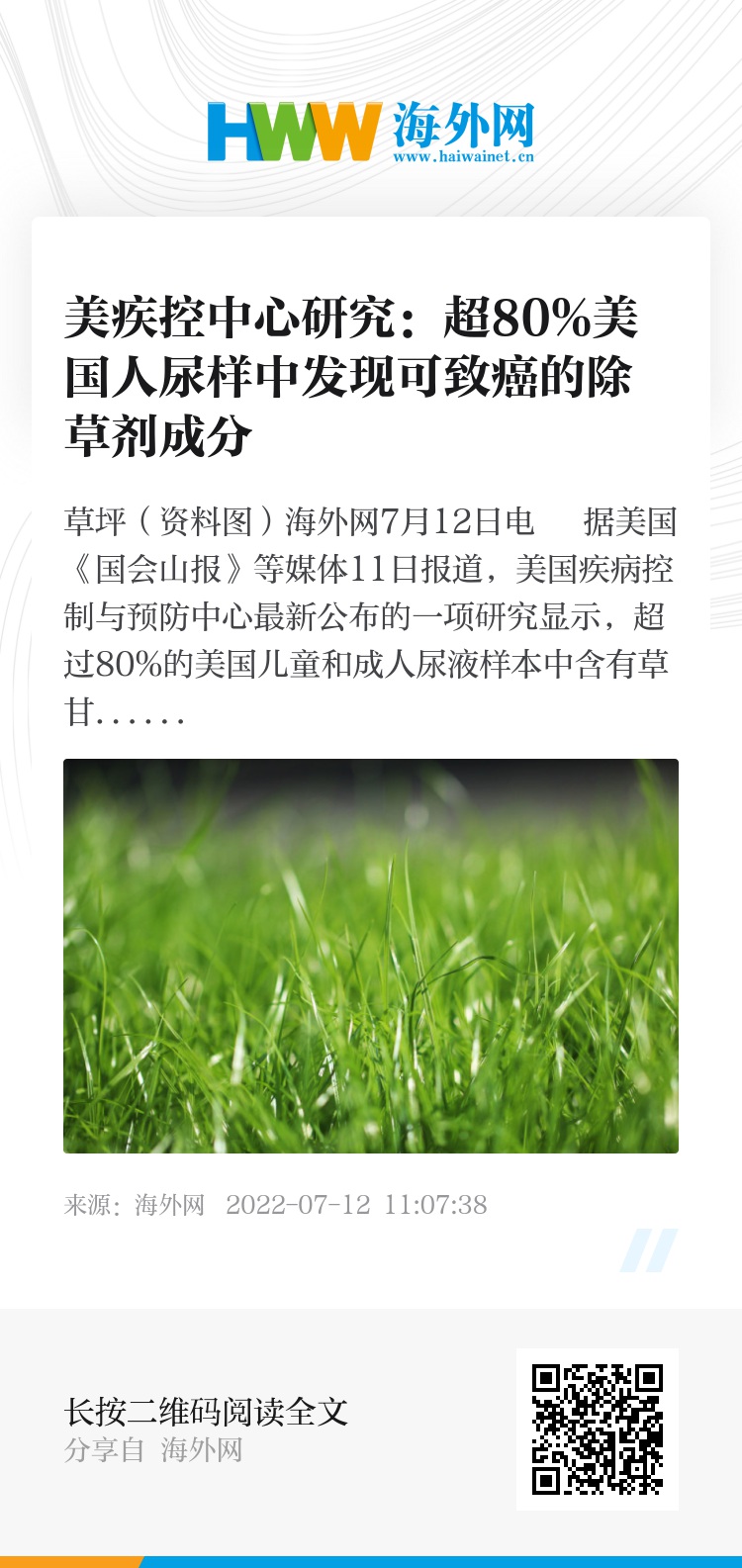 海外网7月12日电 据美国《国会山报》等媒体11日报道,美国疾病控制与预防中心最新公布的一项研究显示,超过80%的美国儿童和成人尿液样本中含有草甘膦,这是一种在美国常用除草剂的主要成分,也是致癌化学物质。