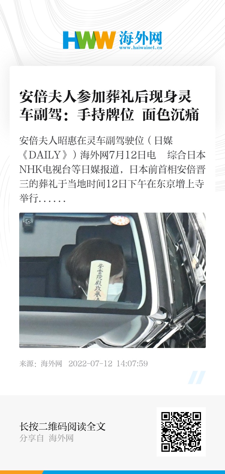海外网7月12日电 综合日本NHK电视台等日媒报道,日本前首相安倍晋三的葬礼于当地时间12日下午在东京增上寺举行。安倍夫人昭惠被记者拍摄到坐在灵车副驾驶位的画面,她手持牌位,面色沉痛。