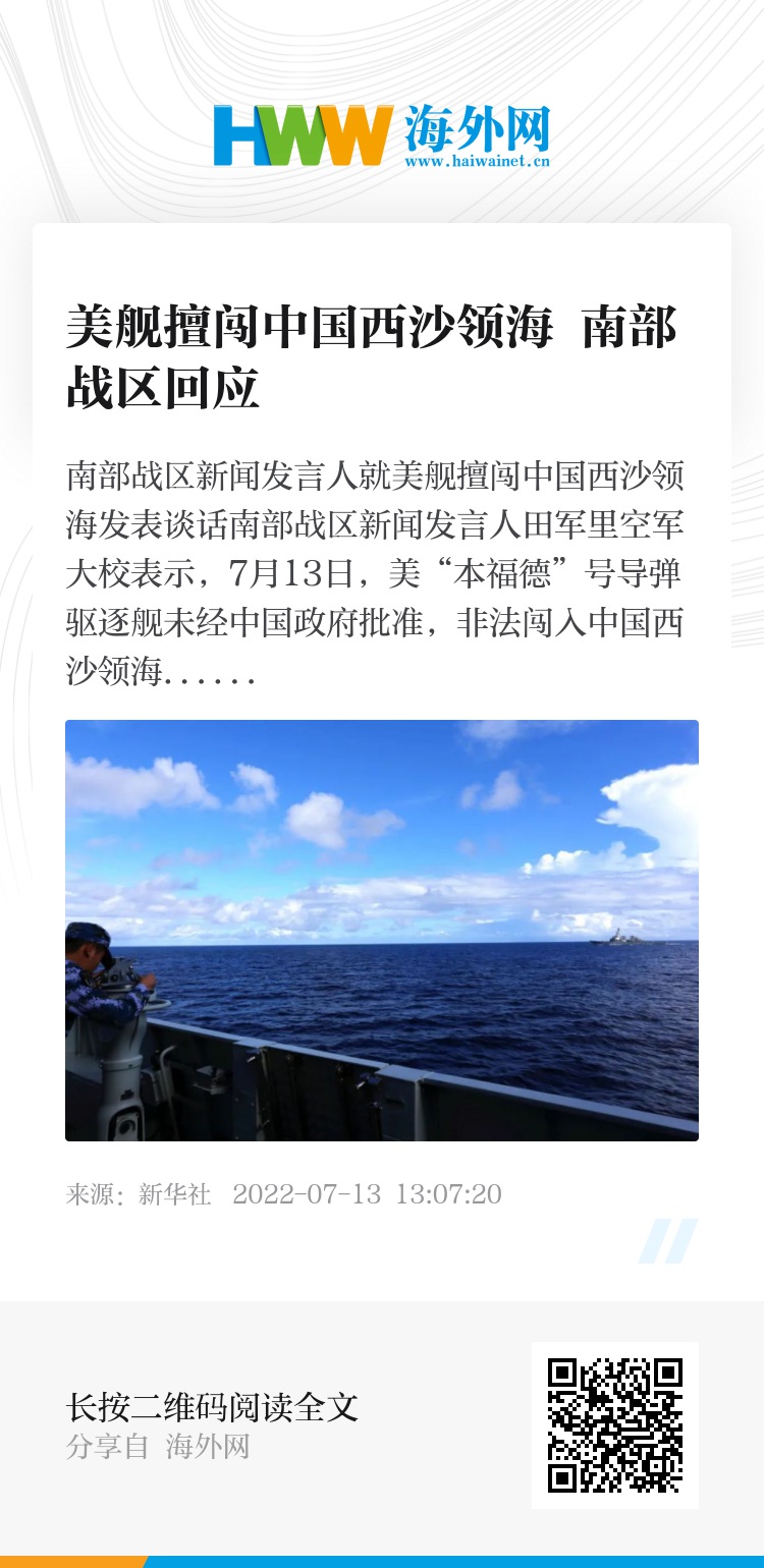 南部战区新闻发言人田军里空军大校表示,7月13日,美“本福德”号导弹驱逐舰未经中国政府批准,非法闯入中国西沙领海,中国人民解放军南部战区组织海空兵力进行跟踪监视并予以警告驱离。美军行径严重侵犯中国主权和安全,严重破坏南海地区和平稳定,严重违反国际法和国际关系准则,是其大搞航行霸权制造南海军事化的又一铁证。事实再次说明,美是不折不扣的“南海安全风险制造者”“地区和平稳定破坏者”。战区部队时刻保持高度戒备状态,坚决捍卫国家主权安全和南海地区和平稳定。