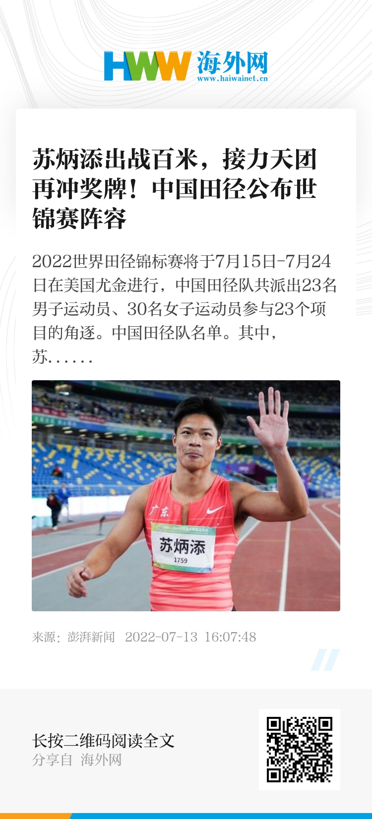 2022世界田径锦标赛将于7月15日-7月24日在美国尤金进行,中国田径队共派出23名男子运动员、30名女子运动员参与23个项目的角逐。