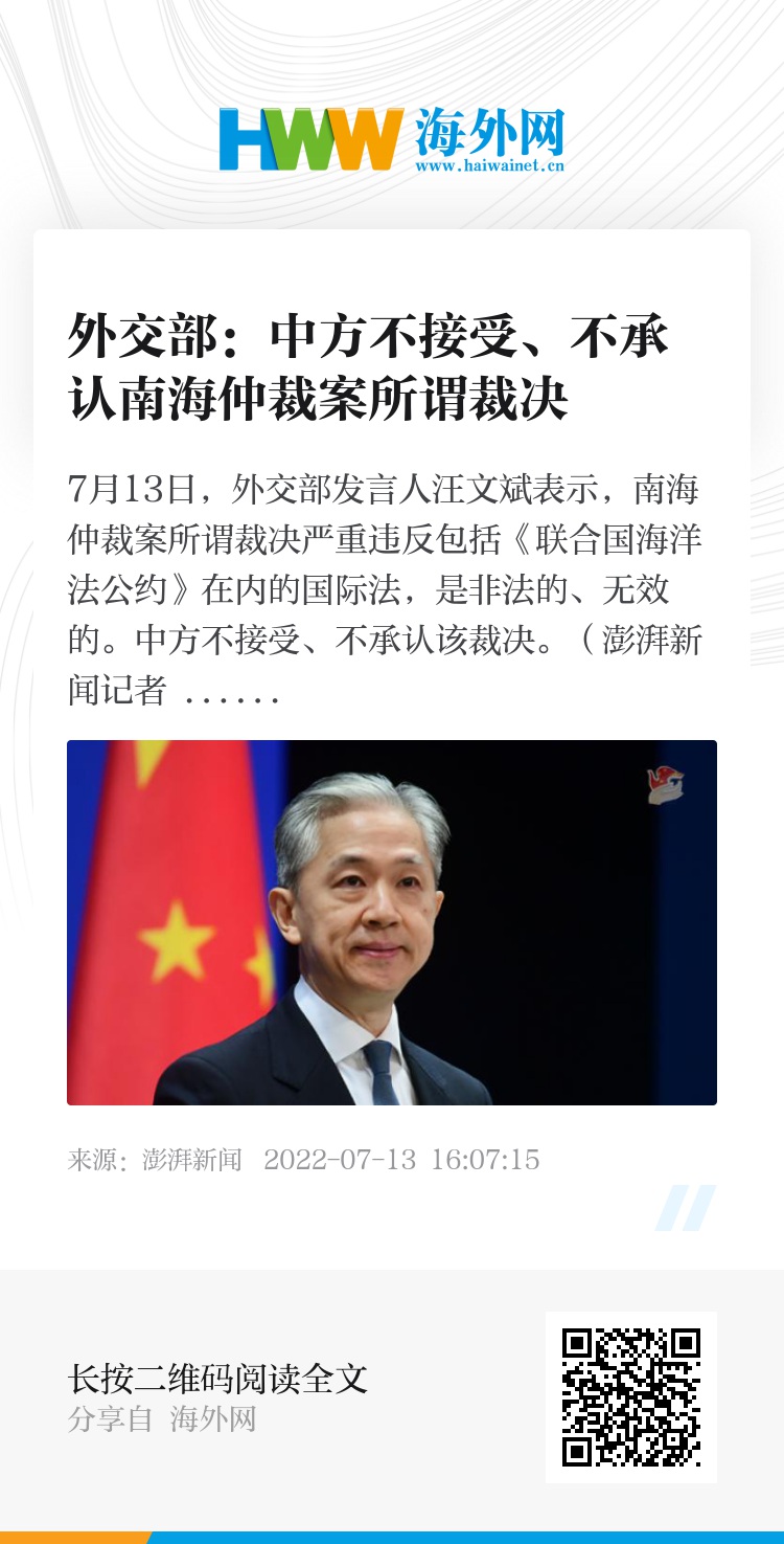 7月13日,外交部发言人汪文斌表示,南海仲裁案所谓裁决严重违反包括《联合国海洋法公约》在内的国际法,是非法的、无效的。中方不接受、不承认该裁决。(澎湃新闻记者 王露 史含伟)