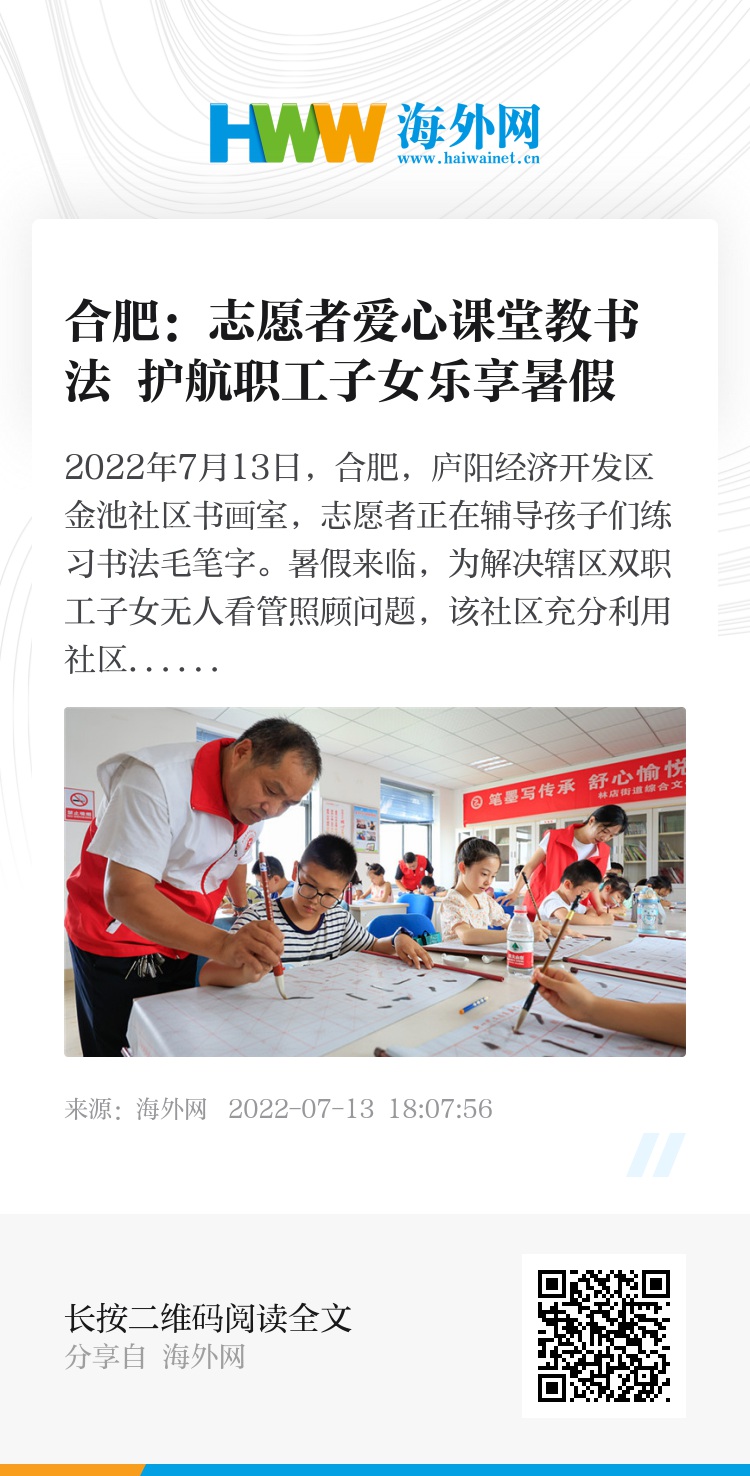 2022年7月13日,合肥,庐阳经济开发区金池社区书画室,志愿者正在辅导孩子们练习书法毛笔字。暑假来临,为解决辖区双职工子女无人看管照顾问题,该社区充分利用社区党群服务中心多功能活动室作用,招募才艺志愿者,为儿童提供为期1个月的学习辅导、书法绘画、科普体验、普法教育等内容,让孩子们度过一个快乐充实的暑假生活。(图:视觉中国)