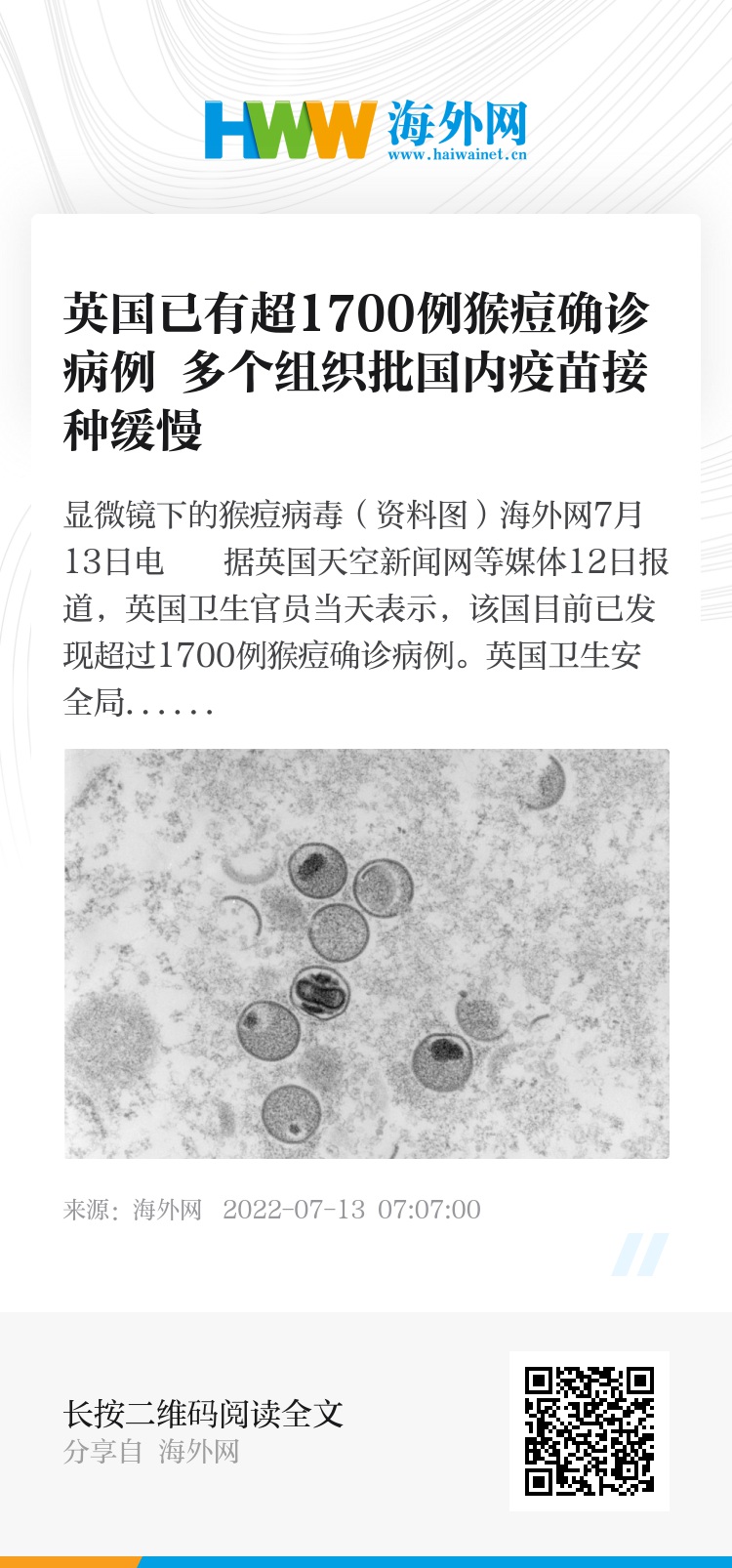 海外网7月13日电 据英国天空新闻网等媒体12日报道,英国卫生官员当天表示,该国目前已发现超过1700例猴痘确诊病例。
